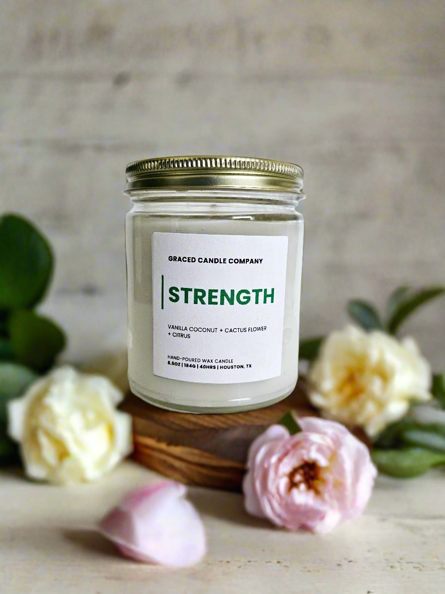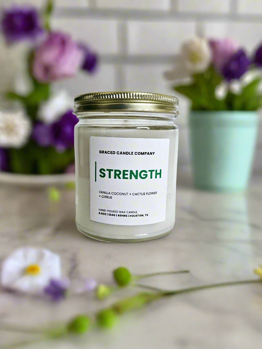 Escape to a serene oasis with the Strength candle, a refreshing blend of cactus flower, creamy coconut, smooth vanilla, and a splash of juicy citrus. This scent is the perfect balance of fresh and tropical. Bright, calming and uplifting.